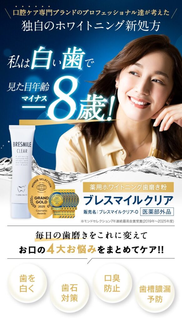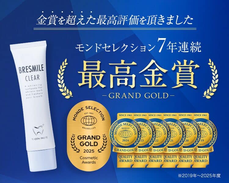 ブレスマイルクリアは[累計600万個突破、楽天ショップ・オブ・ザ・イヤー受賞、モンドセレクション最高金賞をはじめ多くの権威ある賞を獲得]し、品質と実績を確立した薬用ホワイトニング歯磨き粉です。