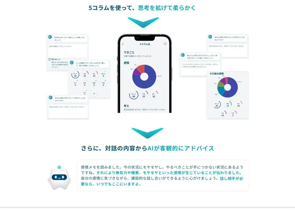GPT-4ベースのチャットボット“ファイさん”が24時間365日ユーザーの話を傾聴し、認知行動療法(CBT)の手法を応用した質問や提案を返してくれます。
