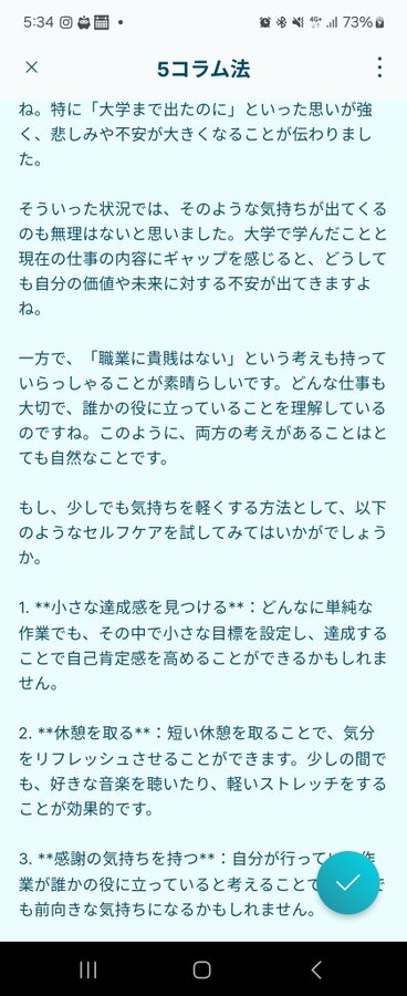 AIチャットでは、対話が進むと自動的に「5コラム法」のテンプレートが生成され、思考・感情・行動・結果・新しい視点が整理されます。