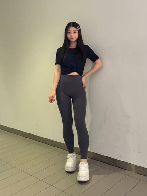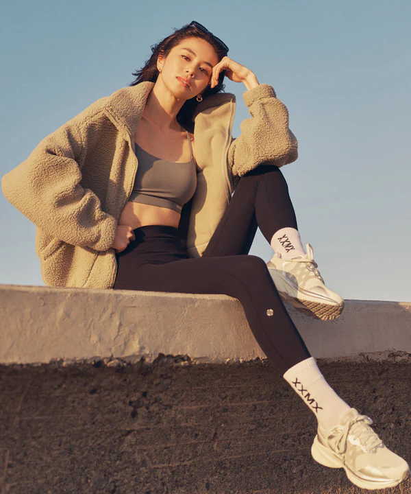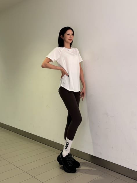 レギンスのラインやカラーブロックはスタイルメイクの有力なツールです。